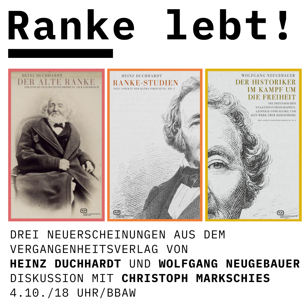 Die Historiker Wolfgang Neugebauer (Akademiemitglied der BBAW) und Heinz Duchhardt (Mitglied der Akademie der Wissenschaften und der Literatur Mainz) haben unabhängig voneinander 2023 mehrere aktuelle Werke zu Ranke publiziert, die sie vorstellen und diskutieren. Ranke ist noch lange nicht „zu Ende geforscht“ ist und ist für Überraschungen immer noch gut. Moderation Akademiepräsident Christoph Markschies.