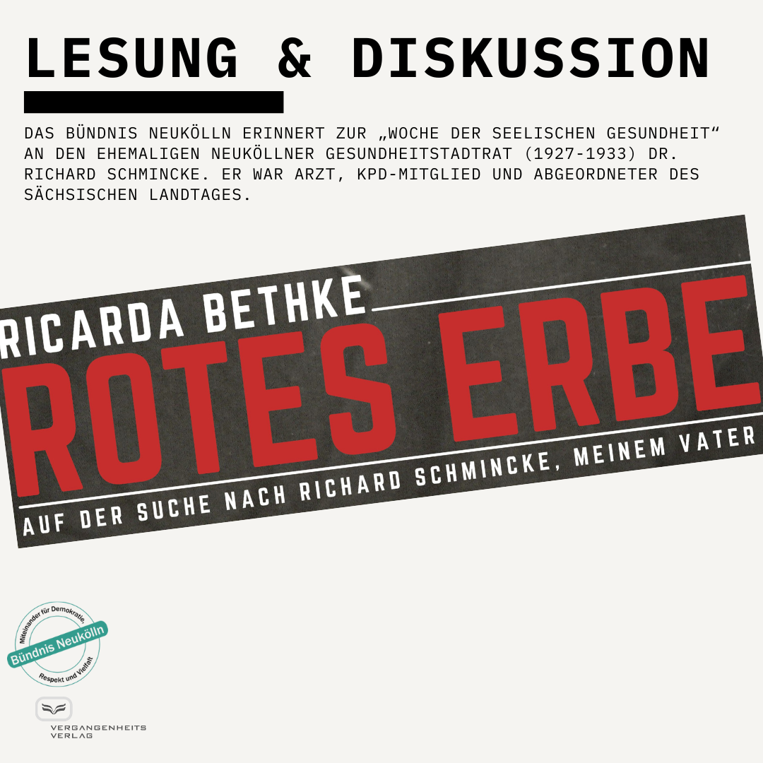 Das Bündnis Neukölln erinnert zur „Woche der seelischen Gesundheit“ an den ehemaligen Neuköllner Gesundheitstadtrat (1927-1933) Dr. Richard Schmincke. Er war Arzt, KPD-Mitglied und Abgeordneter des sächsischen Landtages.