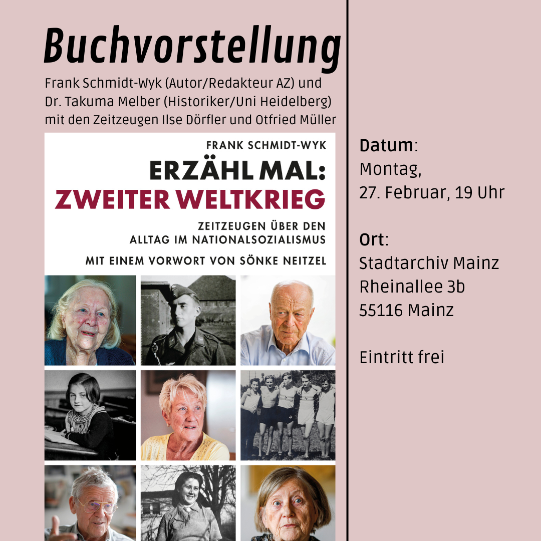 Schmidt-Wyk bricht auf, besucht ältere Menschen in Rheinhessen, die den Nationalsozialismus und den Krieg noch selbst erlebt haben, und lässt sie erzählen, von Erlebnissen, die ihre persönliche Erinnerung bis heute prägen. So entsteht die Serie "Erzähl mal!" in der Allgemeinen Zeitung. Aus der erfolgreichen Reihe ist ein Buch geworden, das Zeitzeuginnen und Zeitzeugen zu Wort kommen lässt. Gemeinsam mit dem Historiker Dr. Takuma Melber (Universität Heidelberg), der das Projekt als wissenschaftlicher Berater begleitet, stellt Frank Schmidt-Wyk die Neuerscheinung vor und diskutiert mit der Mainzer Zeitzeugin Ilse Dörfler (91) und dem Mainzer Zeitzeugen Otfried Müller (92).