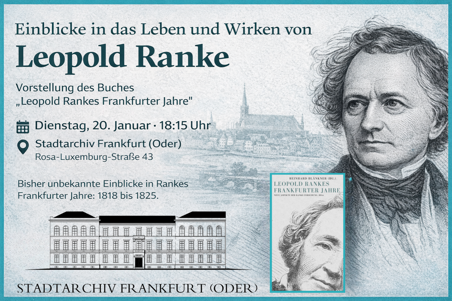 Über Leopold Rankes Jahre in Frankfurt (Oder), von 1818 bis 1825, ist bislang wenig bekannt. Dies gilt für die wissenschaftsgeschichtliche Würdigung seines hier entstandenen Erstlingswerkes „Geschichten der romanischen und germanischen Völker“ (1824) ebenso wie für das kulturelle Gedächtnis der Stadt Frankfurt (Oder), in dem Ranke heute kaum präsent ist. „Abgesehen von Heinrich von Kleist dürfte keine Persönlichkeit der Frankfurter Stadtgeschichte eine ähnlich weltweite, über zweihundert Jahre bis heute andauernde Wirkung erfahren haben“, sagt Herausgeber Prof. Dr. Reinhard Blänkner, emeritierter Professor für Neuere Geschichte und Kulturgeschichte an der Viadrina.