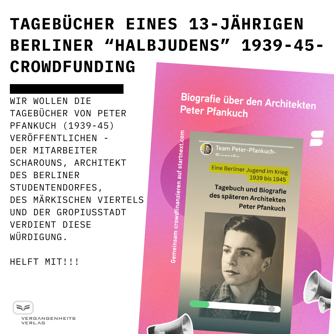 Macht bei unserer Crowdfunding-Aktion mit: Der Architekt Peter Pfankuch war für die Berliner Nachkriegszeit wichtig. Mitbeteiligt am Bau des Berlin-Pavillons, des Studentendorf Schlachtensee, bei Wohnungsbau im Märkischen Viertel und Gropiusstadt und als Mitarbeiter der Akademie der Künste hat er die Stadt geprägt. Nun gilt es Peter Pfankuch neu kennenzulernen: als Kind einer sog. «privilegierten Mischehe», der, gezeichnet von Diskriminierung im Berlin der Kriegszeit, Tagebuch schrieb, und seine Begeisterung für Architektur entwickelte. 1939, 13-jährig, beginnt er mit seinen Aufzeichnungen über seinen Lebensalltag. Eine einmalige historische Quelle. Wer die Herausgabe unterstützen möchte, kann bei unserer Crowdfunding-Aktion mitmachen. Jede Unterstützung hilft, egal wie hoch: www.startnext.com/peter-pfankuch