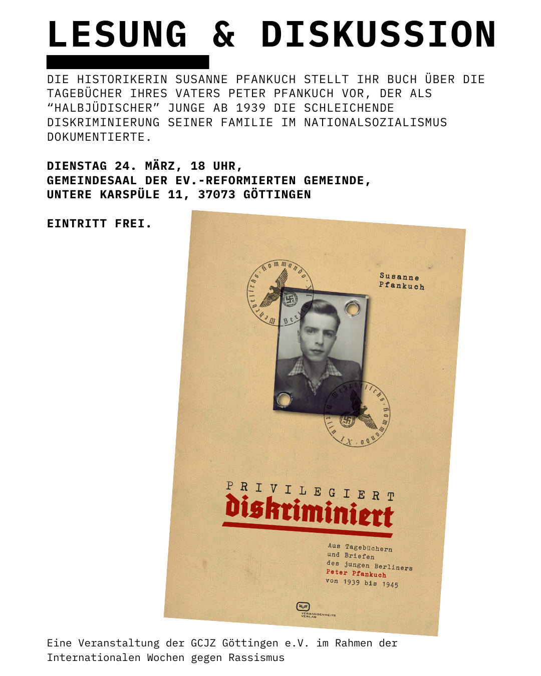 Save the date: Die Gesellschaft für christlich-jüdische Zusammenarbeit Göttingen e.V. hat unsere Autorin Susanne Pfankuch mit ihrer Fallstudie zu sog. "Halbjuden" im NS zu Gast, im Rahmen der Internationalen Wochen gegen Rassismus, die bundesweit stattfinden. 100% Menschenwürde. Zusammen gegen Rassismus und Rechtsextremismus!